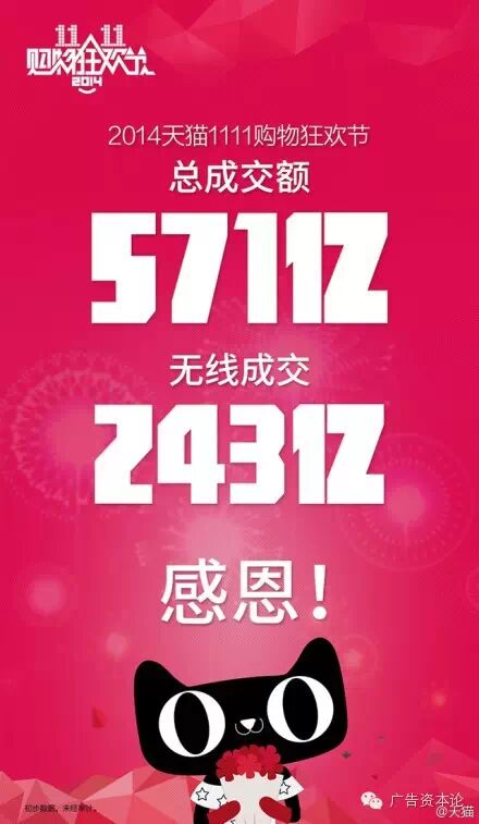 天猫微博:2014天猫1111购物狂欢节总成交额571亿!无线成交243亿!占比42.6%!——感谢!感恩!这仅仅是一个新的开始,也是属于每一个人的奇迹!