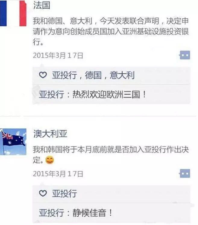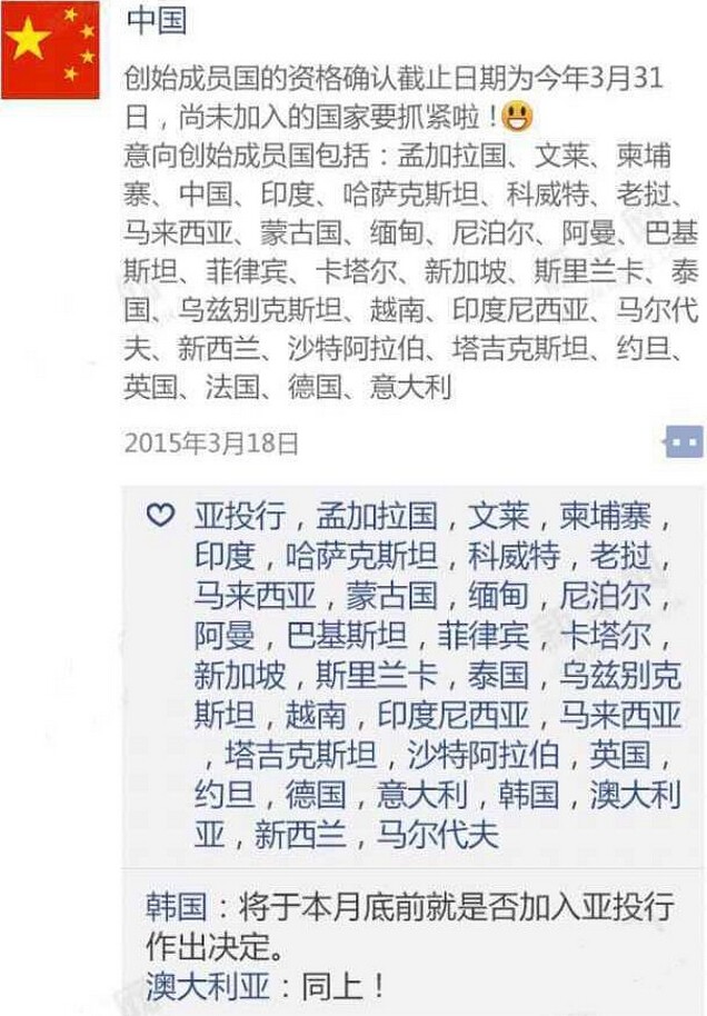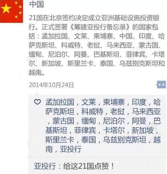 英国一加入亚投行,立刻引发了连锁效应,法国、德国、意大利、卢森堡和瑞士全都给中国递交了申请书,连日本的歪嘴麻生都把嘴正过来说,日本也考虑加入亚投行!