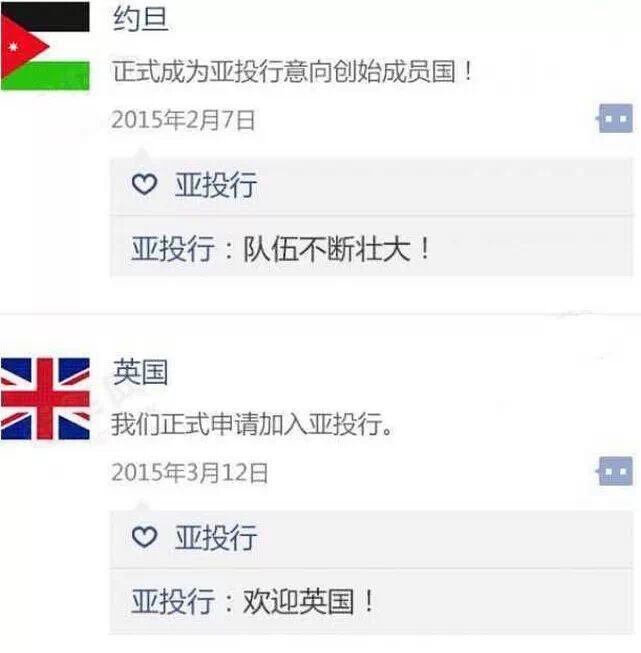 中阿两国在这边一折腾,英国可就受不了了,这可怎么办好呢?中国现在已经惹不起了,得,我加入亚投行,支持一把人民币保我的平安吧,不然马岛那边麻烦大了。