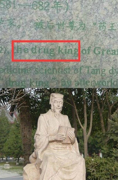 五一小长假来了,当游客们欣赏美景的时候,一些景区的“奇葩翻译”也引发了网友的围观。近日就有媒体报道,西安一处景区将孙思邈的英文翻成了“毒枭”(drug king),虽然景区紧急将译文撤下,但还是引来网友一番戏谑。