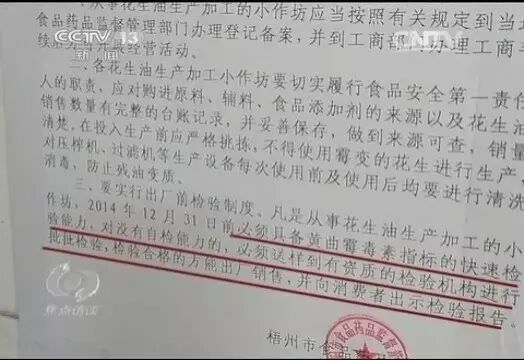 记者调查了广西梧州20多家花生油作坊,没有一家具备黄曲霉素指标的自检能力,也没有一家能做到批批送检,而且也没有一家因此受到任何处罚。这样看来,梧州市食品药品监督管理局的通知,也不过是一纸空文。