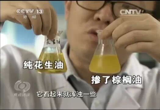 广东中测食品化妆品安全评价中心主任陈智勇说:“在5度的冰箱里边把油冷冻一段时间,可以看出,比较澄清透明的是纯正花生油;怀疑添加了棕榈油的油品看上去就浑浊一些。”