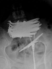 当天晚上,省直中医院急诊科对曲颖进行了抢救,随后送往普外科住院治疗,从X光片可见一捆剪刀横亘在其中下腹部,剪刀长近12厘米。医生诊断腹部肠管少量积气,未见明显液气平面和肠管扩张。