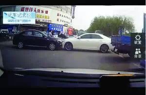 接着黑色轿车倒退,白衣男子正准备站到两车中间,没想到白色轿车突然加速,冲上前来,险些撞上白衣男子。随后黑色轿车女司机下车,站在白色轿车前,情绪比较激动,嘴里不停地说着什么。白衣男子上前拖住女司机。就在这时,白色轿车倒了一下车,狠狠地撞向黑色轿车,黑色轿车的保险杠被撞脱落。女司机见状上前踢白色轿车车门。白色轿车没有理会,快速驶离了现场。黑色轿车也随即追了出去。