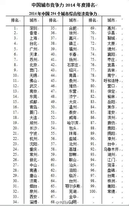 《报告》中数据显示,2014年综合经济竞争力指数排名前十的城市依次是:深圳、香港、上海、台北、广州、天津、苏州、北京、澳门、无锡,这些城市主要集中在珠三角、长三角、环渤海和港澳台地区。广大中西部地区无一城市进入综合经济竞争力十强之列,中西部城市中排名最前的是武汉,位列第12位。