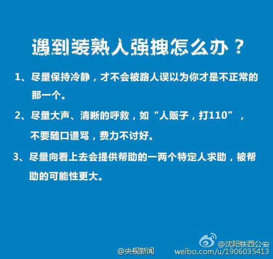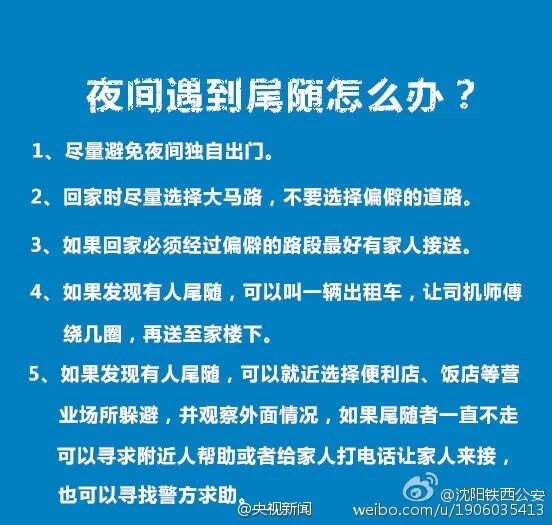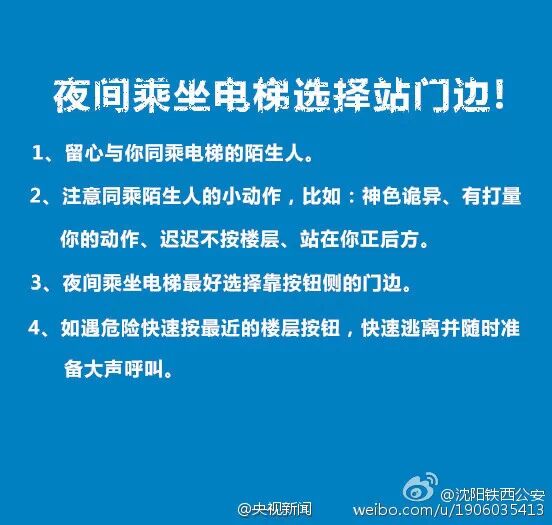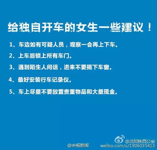 身女性遭遇侵害案件时有发生,夜间被尾随、单独坐电梯、乘坐黑车、独自驾车外出等,是比较常见的危险情形。不是每个女生都要成为女汉子,也不能保证男朋友时刻陪伴在左右,怎么办?看下图,告诉你31条安全忠告。