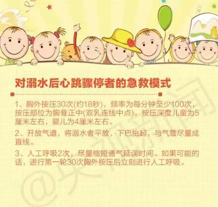 如呼吸心跳停止,立即胸外按压100次/分,按压30次给2次人工呼吸。心肺复苏要持续进行,不能停顿,直到溺水者苏醒或专业急救人员赶来。尤其对儿童,不要轻易放弃复苏。