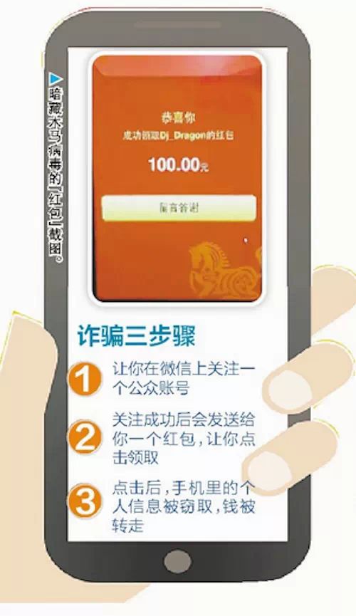 微信红包最近很火。看见红包,你是否顿生一种火速点之而后快之感?当心了!当心了!最近有不法分子鼓捣出了一种 “发红包”的病毒,在用户点击时盗走其个人信息及与手机绑定的网银、支付宝中钱款,警方日前对这种新型电信诈骗发出了预警。