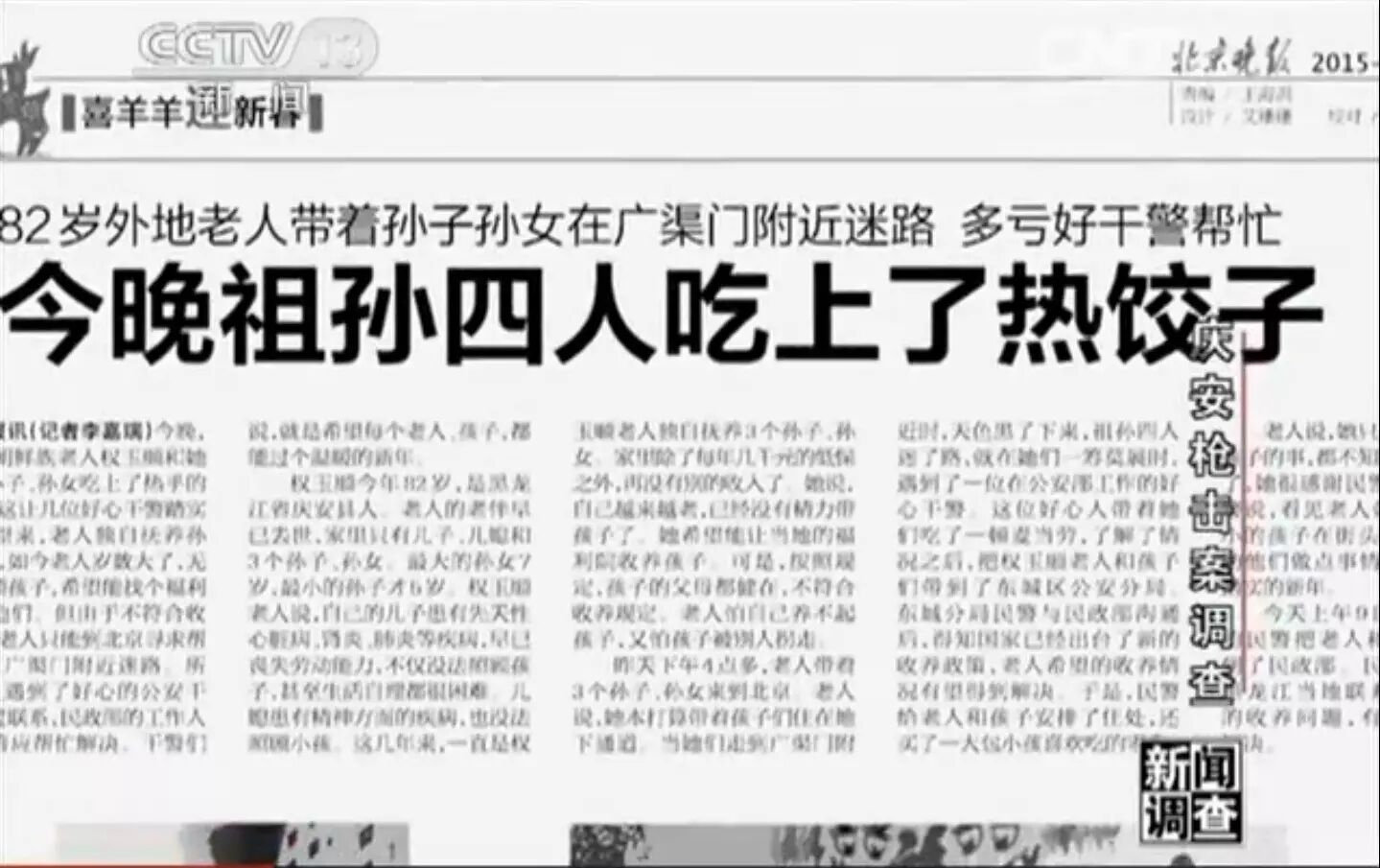 在今年2月18日的《北京晚报》上刊登了一篇文章,这是权玉顺带孙子孙女乞讨第二次被录入新闻。这篇文章讲述了权玉顺今年春节前在北京乞讨迷路了,遇到一个热心警察,在他的帮助下找到民政部,反映了要送三个孩子去福利院的愿望,这大约是权玉顺惟一一次在乞讨中向政府部门反映问题。