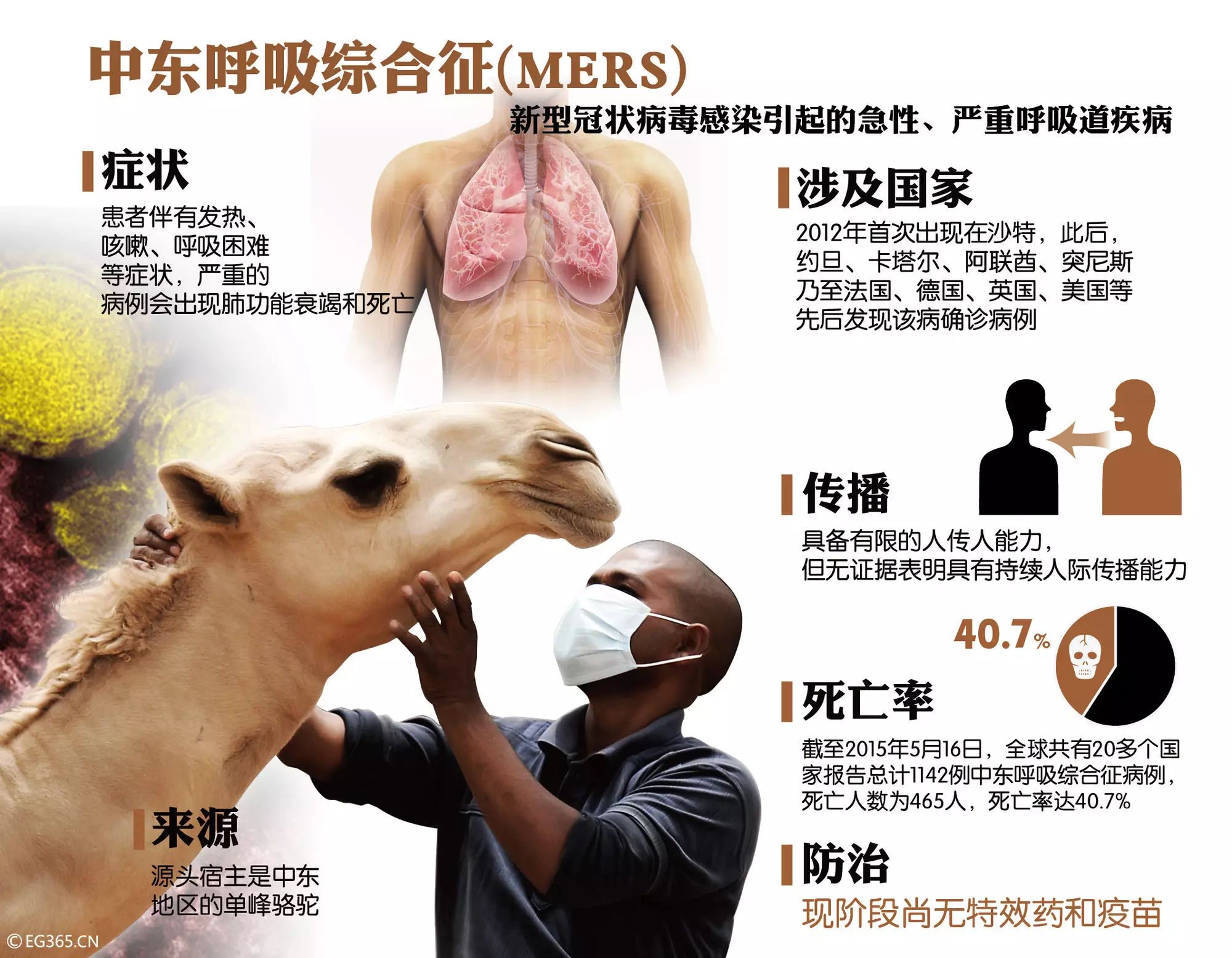 引发中东呼吸综合征的是一种冠状病毒,与曾在中国肆虐过的“非典”(SARS)病毒接近。其典型病例常呈现发热、咳嗽和气短等症状,重症病例可导致呼吸衰竭。自2012年首次发现中东呼吸综合征以来,世界各国共向世卫组织报告了1134个病例,其中包括至少427个相关死亡病例,绝大多数出现在沙特阿拉伯境内。