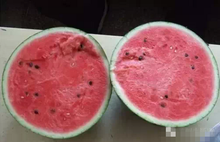 1 瓜皮上的黄绿条纹不均匀,切开后瓜瓤特别鲜艳,但瓜子却是白色的,吃起来没有甜味。