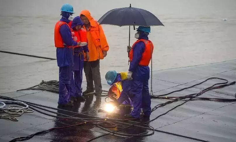 施救人员带着切割设备,还有水枪登上“东方之星”船底。