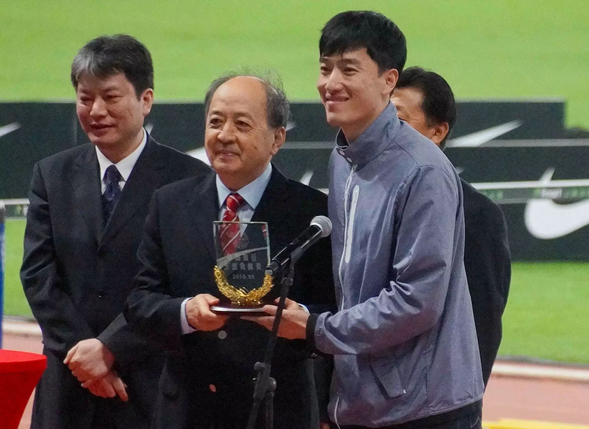 △今年5月17日晚,肖天为刘翔颁发中国田径杰出贡献奖杯。
