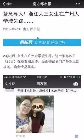 微信的来源基本都来自广州《南方都市报》旗下的微信公众号“南都”,原标题为“紧急寻人!浙江大三女生广州大学城失踪”。