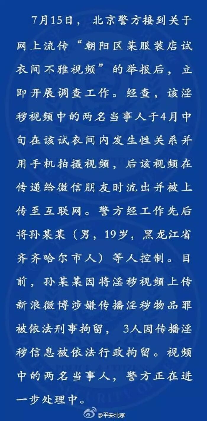 19日晚间,北京市公安局官方微博“平安北京”发布有关“某服装店试衣间不雅视频”的最新情况通报。通报称,涉及传播淫秽信息的3名嫌疑人已被行政拘留,警方正在对视频中两名当事人进一步处理中。