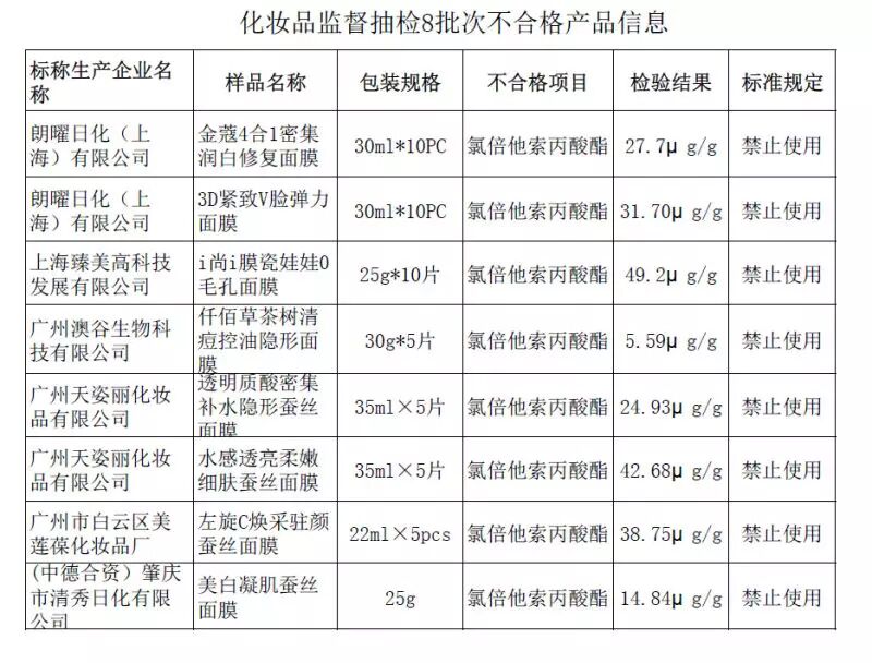 国家食品药品监管总局1日公布了对面膜类化妆品的监督抽检结果,8批次产品存在非法添加禁用物质、违规使用限用物质等问题。食药监总局要求,对已上市销售产品立即采取下架、召回等措施;彻底查清不合格产品的批次、数量和流向,对企业违法违规问题依法查处,涉嫌犯罪的移交公安部门追究刑事责任。