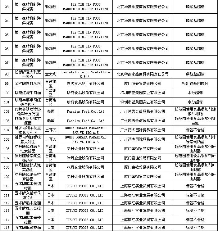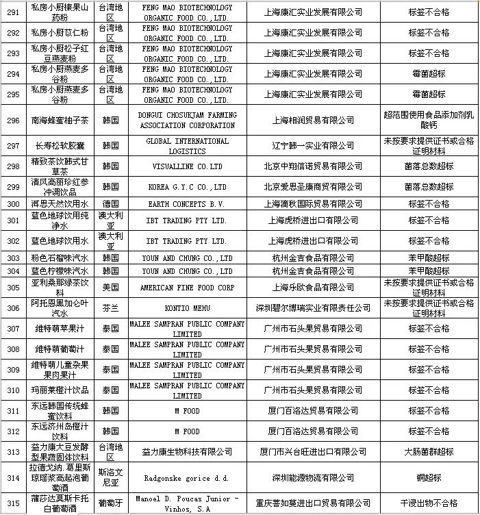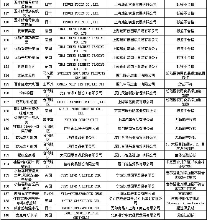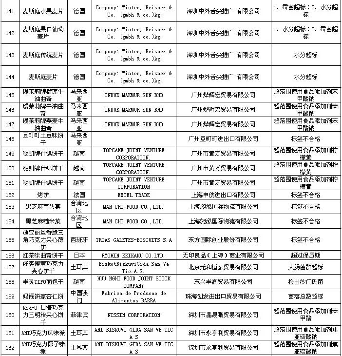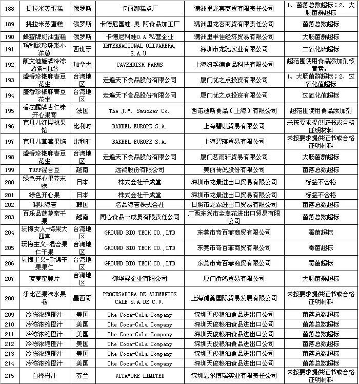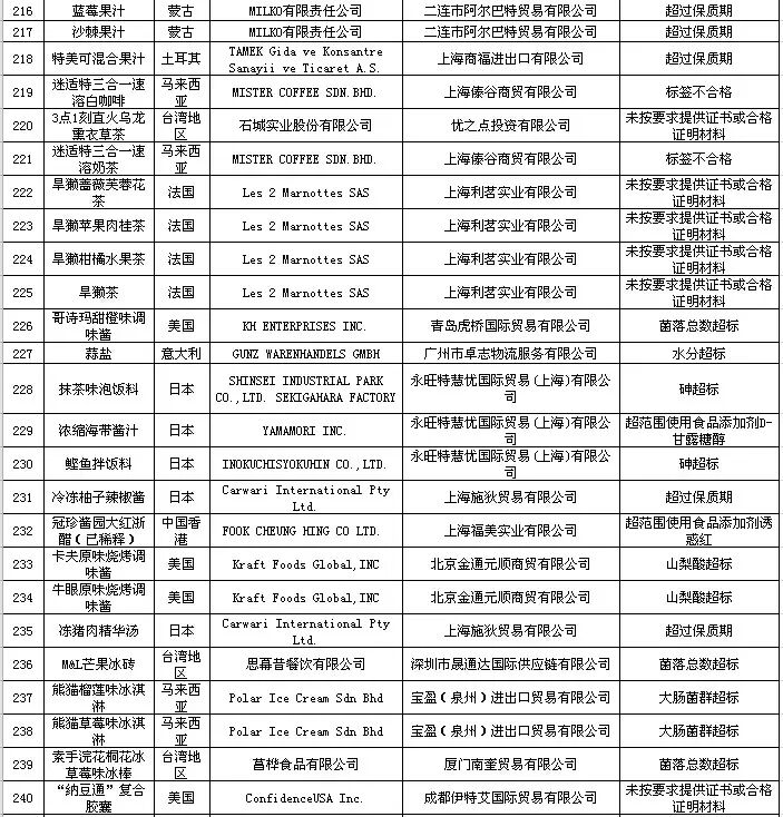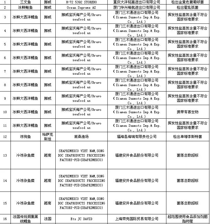 其中挪威进口的多批次冰鲜大西洋鳕鱼、三文鱼、冰鲜鲑鱼因挥发性盐基氮含量不符合国家标准要求、检出金黄色葡萄球菌等原因已经被销毁。多批次来自美国,制造商为可口可乐公司的冷冻浓缩橙汁因菌落总数超标已经退货。此外,无印良品(上海)商业有限公司则因数款食品超过保质期登上黑榜。