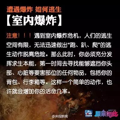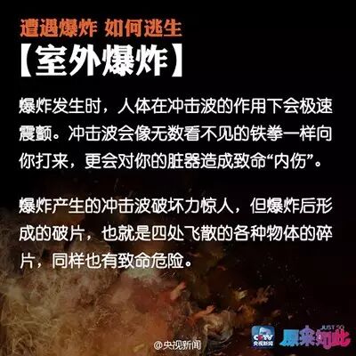 天津滨海新区一危险品仓库发生爆炸,悲痛和震惊之余,事故也为我们敲响警钟。伴随巨响,爆炸导致的冲击波、破片及高温可能瞬间致命……掌握正确的逃生法则能换来一线生机。在遇到爆炸时,我们该如何自救,又可以如何救助别人?