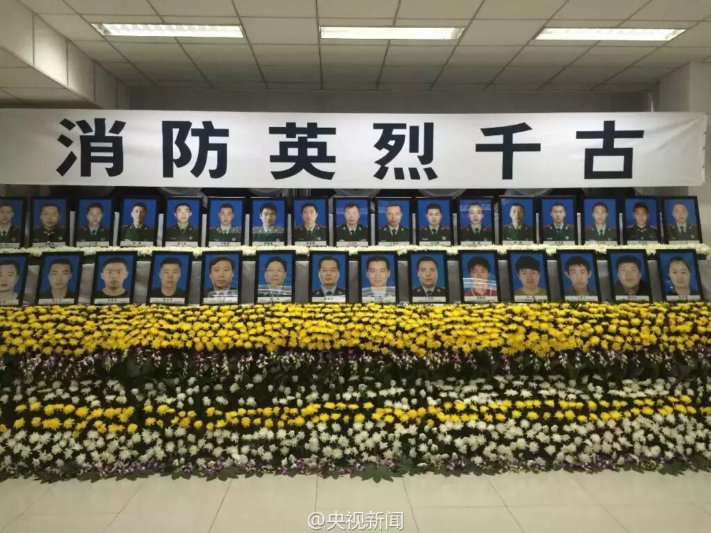 设在公安消防开发区支队大楼内的吊唁灵堂,是悼念仪式举行地之一。悼念的队伍缓缓移动,在遗相前庄重脱帽,向英雄寄以深深的哀思。除了消防队的官兵以外,很多企事业单位、机关单位,还有街道社区以及还在执勤和救援任务的救援官兵,也向这些消防官兵致以最崇高的致意。