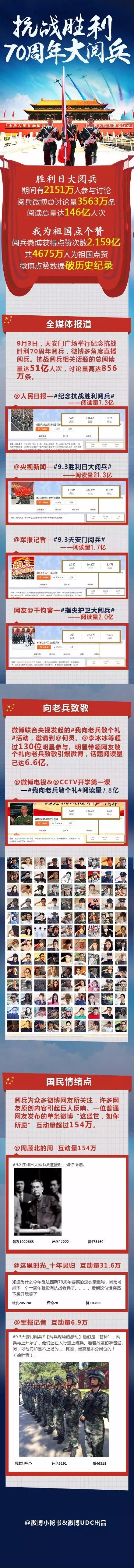 9月3日,胜利日大阅兵当天,全球超10亿网民通过互联网浏览和收看;据@微博小秘书数据,有2151万人微博参与讨论,产生3563万条讨论,阅读总量达146亿人次;4675万人为祖国点赞,点赞2.159亿次破历史记录。央视新闻#9.3胜利日大阅兵#直播报道话题阅读量超20亿。