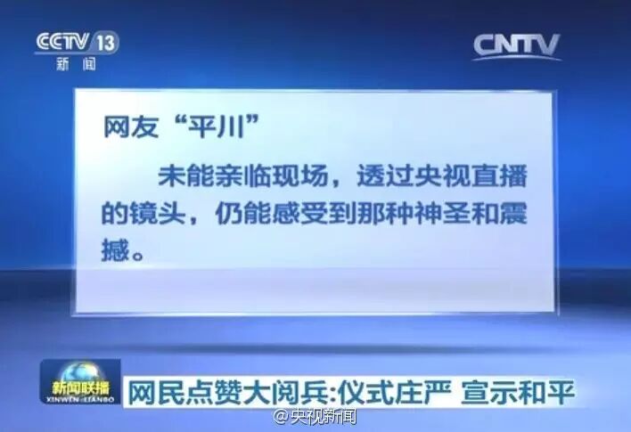 网友"平川":未能亲临现场,透过央视直播的镜头,仍能感受到那种神圣和震撼。网友"张绪明":阅兵式阅的不仅是"兵",更有我们的爱国情感!
