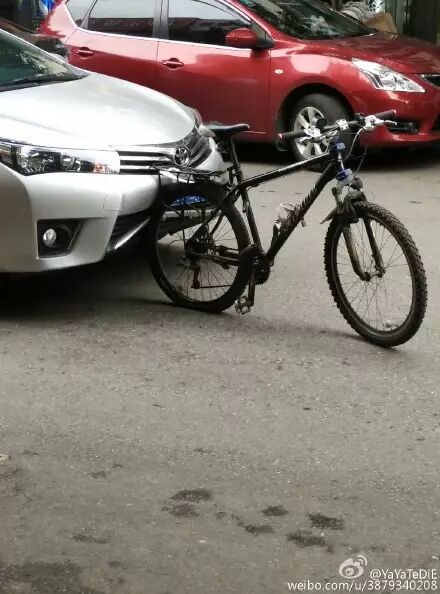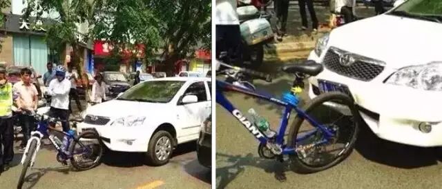据悉,事故现场自行车开始拔不出来,交警指挥拽着自行车,让丰田倒车,好不容易分离了。。。自行车主淡淡的说了一句,“哎,车胎有点歪了啊”。。。