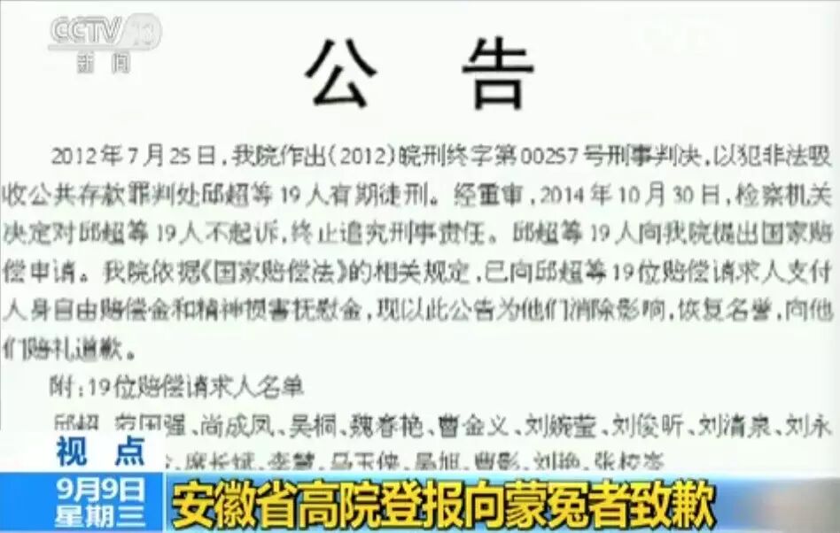 9月7日,安徽省高级人民法院在《亳州晚报》上刊登了一则公告,为一起“集资诈骗案”中原判有罪的邱超等19人消除影响、恢复名誉,并向他们赔礼道歉,同时在公告中还附上了这19位赔偿请求人的名单。
