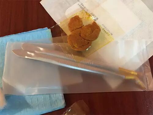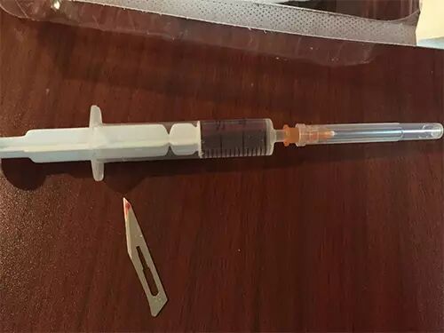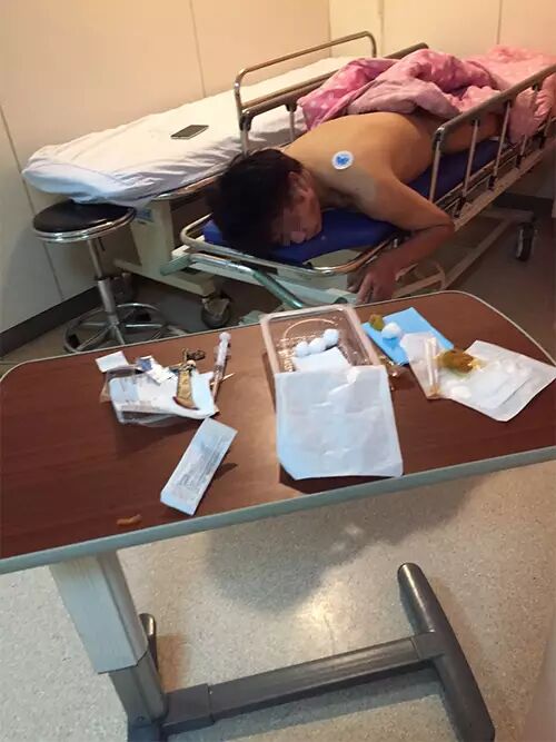 颜师傅被送到医院后,刘医生先给他屁股打了麻醉针,局部麻醉。接着给伤口消毒后,再用镊子将刀直接拔出来,手术很顺利。