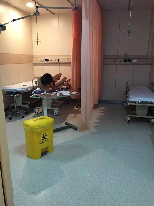 下午1点,受伤男子趴在邵逸夫42号急救病床上,头软软软地朝下,银黑色的头发遮住了脸,被子裹着一丝不挂的身子,一言不发。