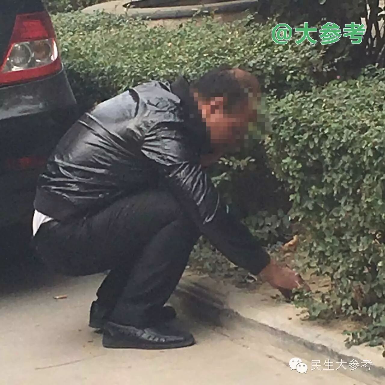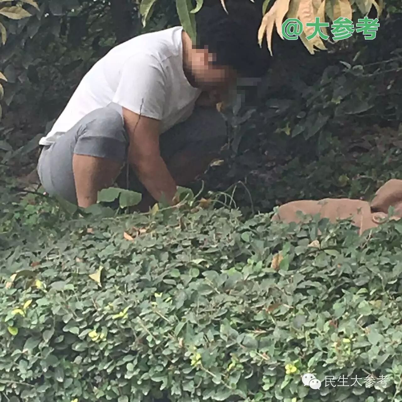 ▲小区绿化带的桃树上,一老人跪着上吊自杀身亡