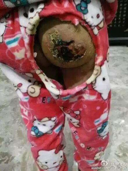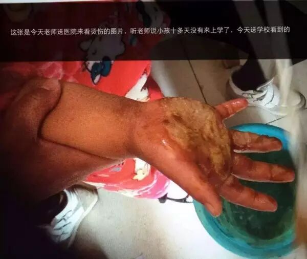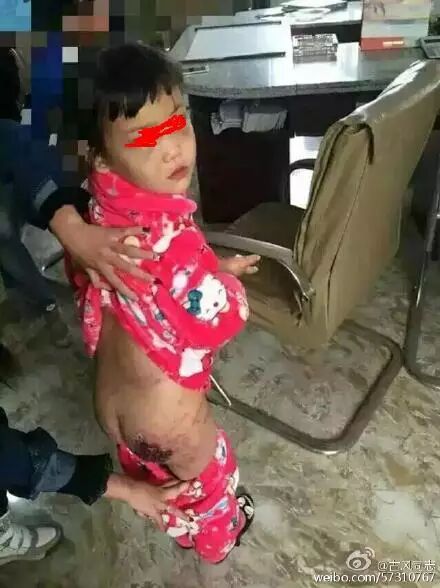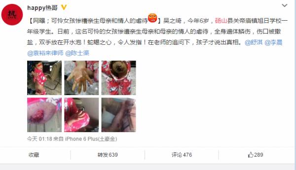 有网友在微博贴出一组图片:“据网友爆料:安徽砀山县关帝庙镇一名6岁女童惨遭亲母和母亲的情人的虐待,全身遍体鳞伤,伤口被撒盐,双手放在开水泡!不过孩子的老师了解真相后已报警,虐童母亲已被拘留,其情人已逃跑。” 好心痛!
