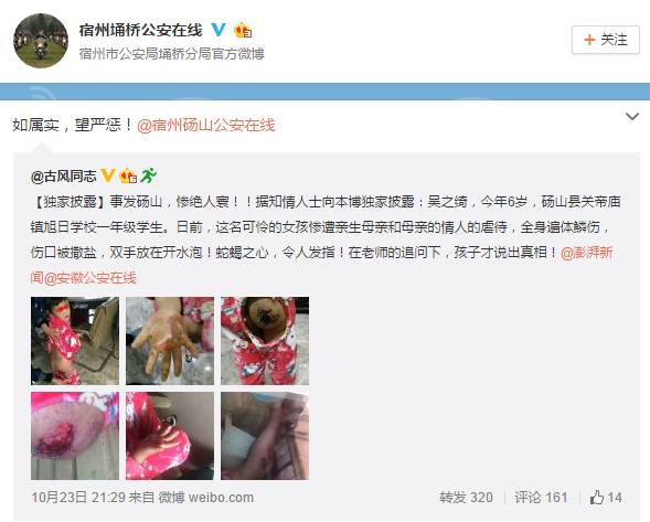 随后宿州公安部门也转发了微博,并@砀山公安在线:如属实,望严惩!