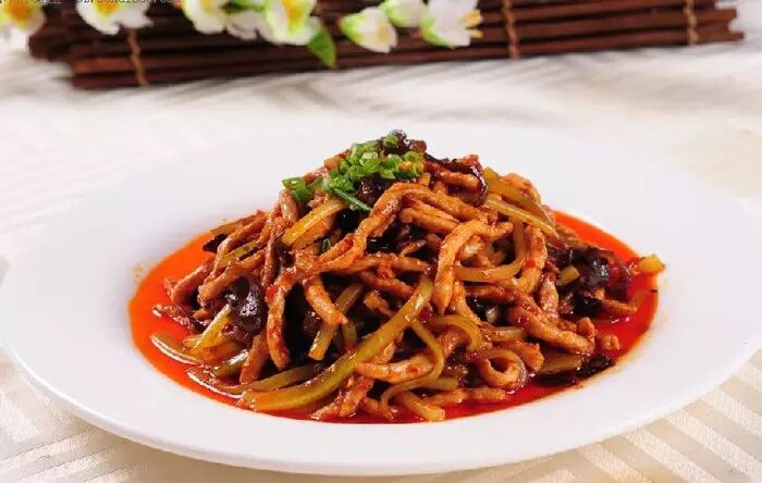 原材料是切成二粗丝的猪肉和青笋,而二粗丝的标准为长10厘米、宽0.3厘米、高0.3厘米。