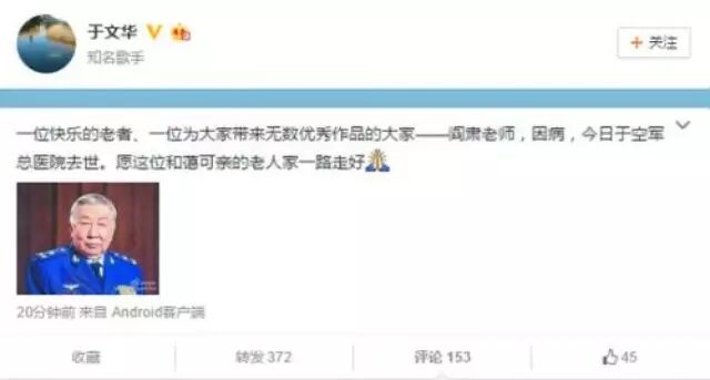 一则“于文华误发阎肃去世微博”的消息刷遍各大社交软件。尽管于文华本人迅速删除了该微博并进行辟谣道歉,但仍然引起了网友们大面积吐槽。目前阎肃正因病休养,其子阎宇透露阎肃已从重度昏迷转为中度。在为阎肃老师祝福的同时,这一起大乌龙事件也值得引起深思。实际上,近年来被谣传死亡的名人很多,金庸先生更是成了“专业户”。原因到底是啥?也许最大的原因就是——人太有名。