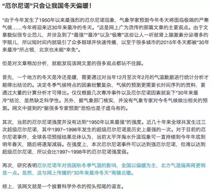 近日,“2015年将是30年来最冷冬天!比2008年还强烈”的消息引爆微信朋友圈和微博,“中枪”的城市有北京、南京、杭州、青岛、无锡……几乎囊括了全国30多个城市,今年冬天真有这么冷吗?一起来看看气象专家怎么说。