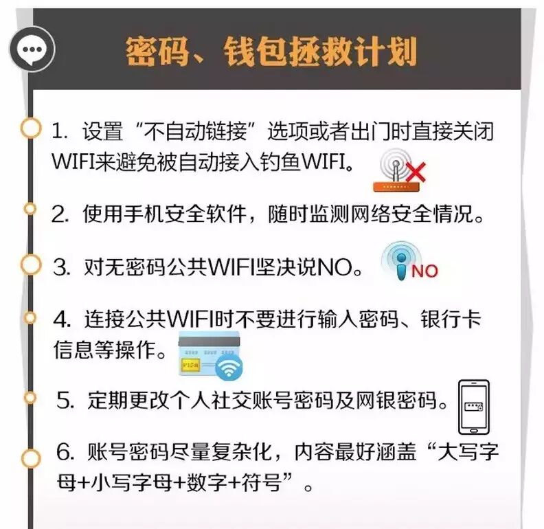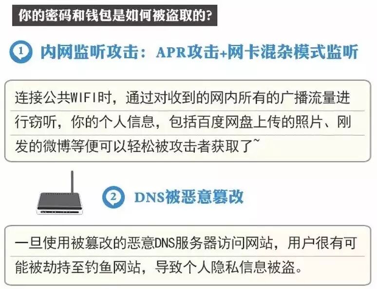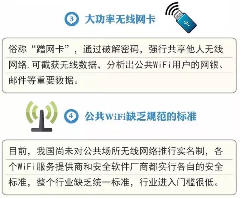 WiFi信号数量巨大,监管难度大,因此,大家尽量不要使用公共WiFi。即便需要使用,也要选择由正规商家提供的,即便出现问题也有途径进行追查。