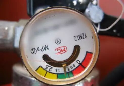 当指针指到红色区内时,表示灭火器内干粉压力值偏小,在遇到火灾时会不能喷出,说明该灭火器已经失效。这时应到正规消防器材店重新充装干粉。
