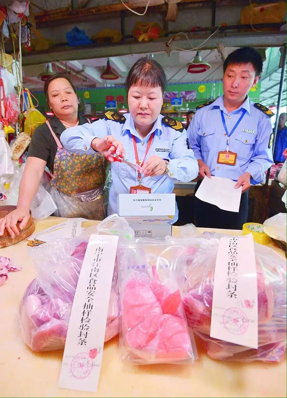11月5日下午,广西南宁市食药监管部门联合当地公安部门,对南宁市江南区淡村商贸城猪肉摊点进行了突击检查。根据现场快速检测,3个摊点销售的猪肉硼砂检测呈阳性。
