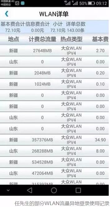 无独有偶,同样是前天,南京的任先生早在7点左右起床,然后发现——自己的WLAN流量一夜之间产生了上百条登录使用信息,扣费不一,而且登陆地点遍布甘肃、山东、新疆等全国近十个省市和地区!