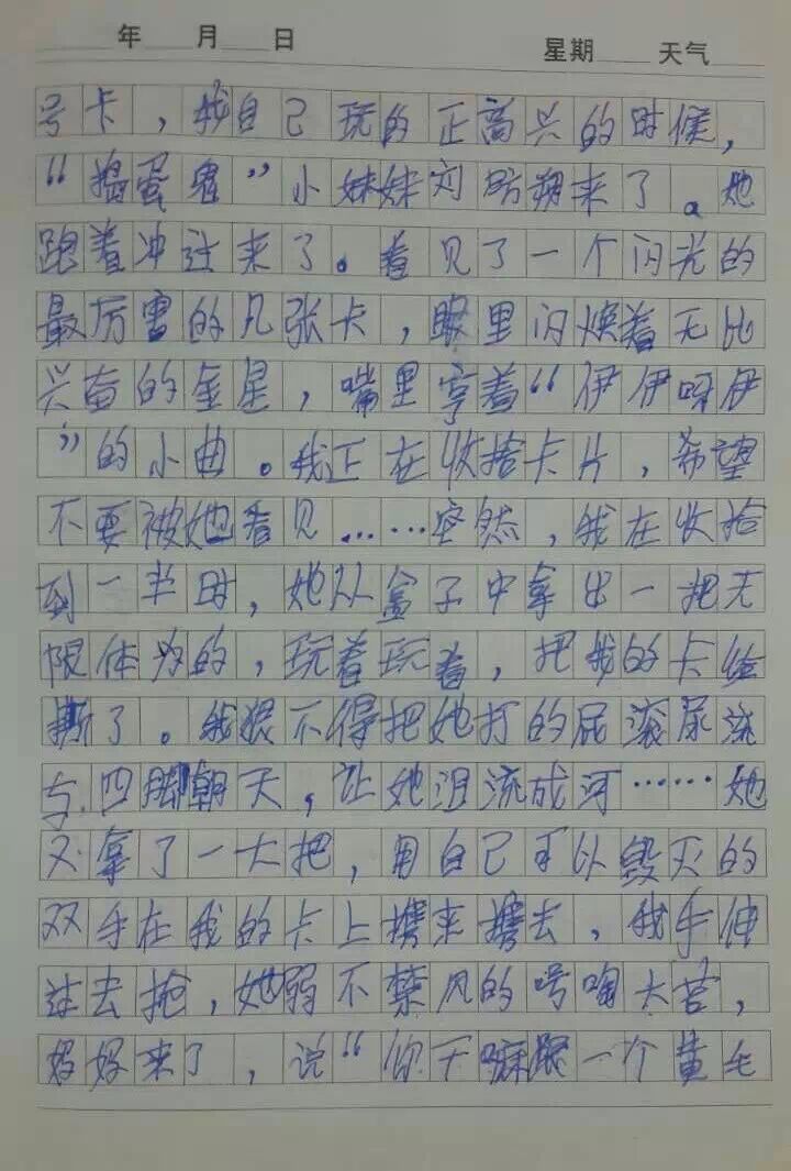 一天,我在家里玩新买的“赛尔号”卡,玩得正高兴的时候,“捣蛋鬼”小妹妹来了。她看见最厉害的几张卡,眼里闪烁着无比兴奋的金星,嘴里哼着“咿呀咿呀”的小曲。我正在收拾卡片,希望不要被她看到……突然,我在收拾到一半时,她从盒子里拿出一把“无限体力”的,玩着玩着,把我的卡给撕了。当时,我恨不得把她打的屁滚尿流与四脚朝天,让她泪流成河……她又拿了一大把,用自己可以毁灭的双手在我的卡上扯来扯去,我手伸过去抢,她居然弱不禁风的嚎啕大哭。妈妈来了,对我说:“你干吗跟一个黄毛丫头斤斤计较!你给她就是了。”此时此刻,我被气得一肚子的火,就像一个还在吹的又大又圆的气球,非要把我气到危不可及的顶峰,随时随地都要爆炸。这样对我,这究竟是为什么?
