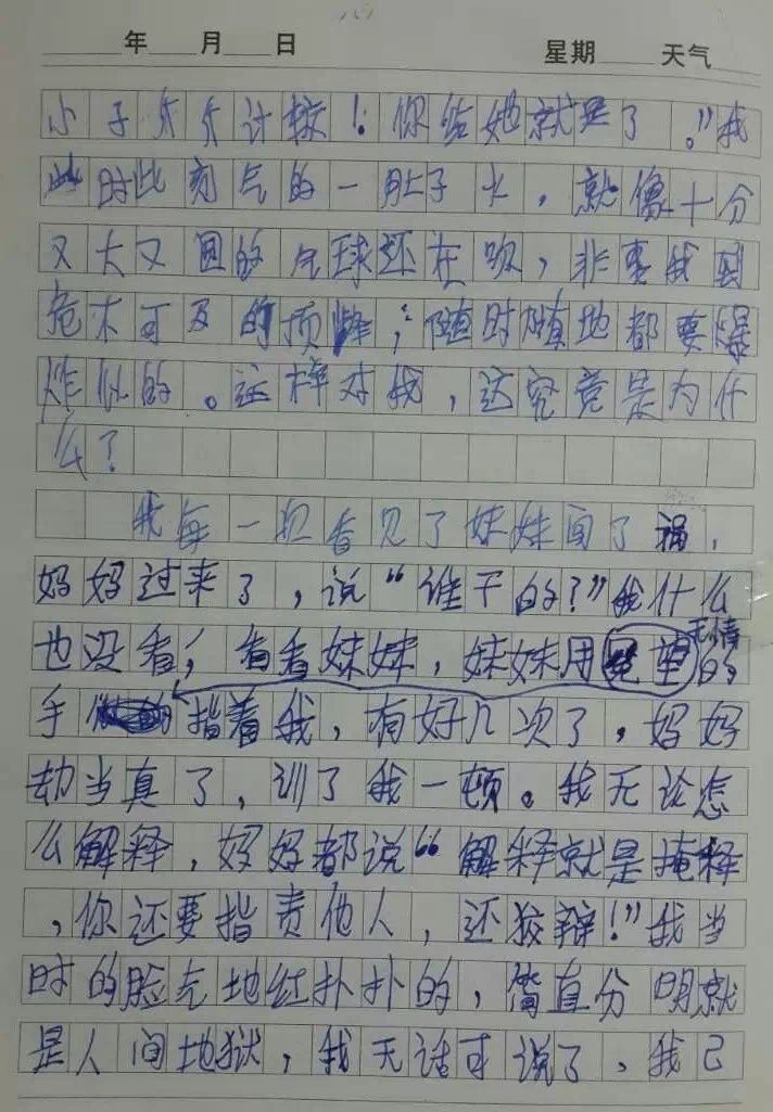 我每一次看到妹妹闯了祸,妈妈过来了问:谁干的?我什么也没看,看看妹妹用无情的手冤枉的指着我,有好几次,妈妈居然当真了,训了我一顿。无论我怎么解释,妈妈都说:“解释就是掩饰,你还要指责他人,还狡辩!”我当时的脸就被气得红扑扑的,简直分明就是人间地狱,我无话可说了,我已经完全……
