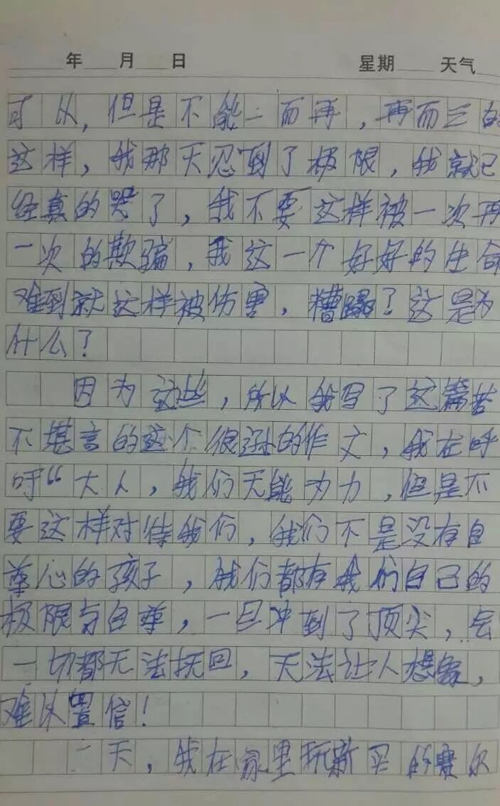 因为这些,所以我写了这篇苦不堪言而且很逊的作文。我在呼吁:大人,我们无能为力,但是不要这样对待我们,我们不是没有自尊心的孩子,我们也有我们的极限与自尊,一旦冲到了顶尖,会一切都无法挽回,无法让人想象,难以置信!