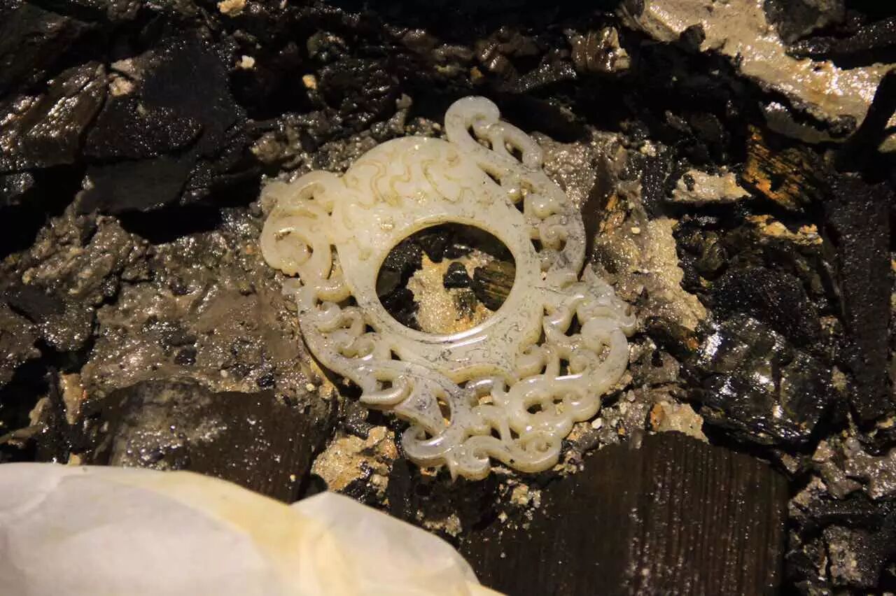 考古人员在清理主椁室过程中,发现了一件保存极为完整的韘(shè)形佩,近似于鸡心的形状,大小约为7*10厘米左右,上面有龙和凤的纹饰,栩栩如生,做工十分精美。南昌西汉海昏侯汉墓考古领队杨军认为,一般使用这种鸡心佩和这种韘(shè)形佩,应该都是属于皇帝和诸侯王。而韘(shè)形佩的出现将墓主身份引向了第一代海昏侯刘贺。