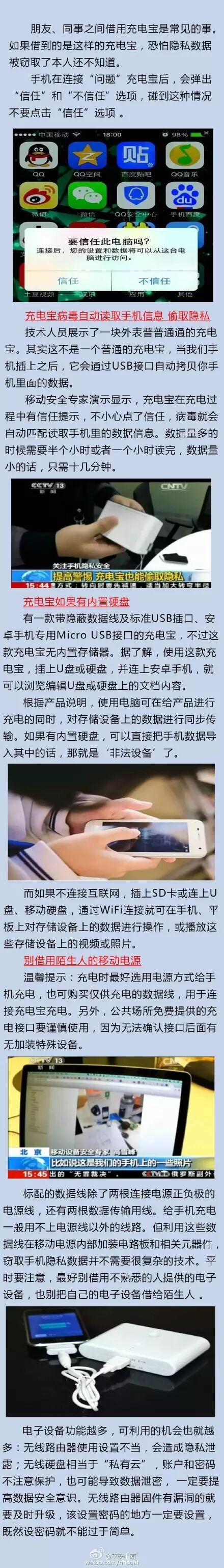 朋友、同事之间借用充电宝是常见的事。如果借到的是这样的充电宝,恐怕隐私数据就极易被窃取了。手机在连接“问题”充电宝后,会弹出“信任”和“不信任”选项,碰到这种情况不要点击“信任”选项 。关于充电宝可能存在的“泄密”问题,戳图来了解吧。