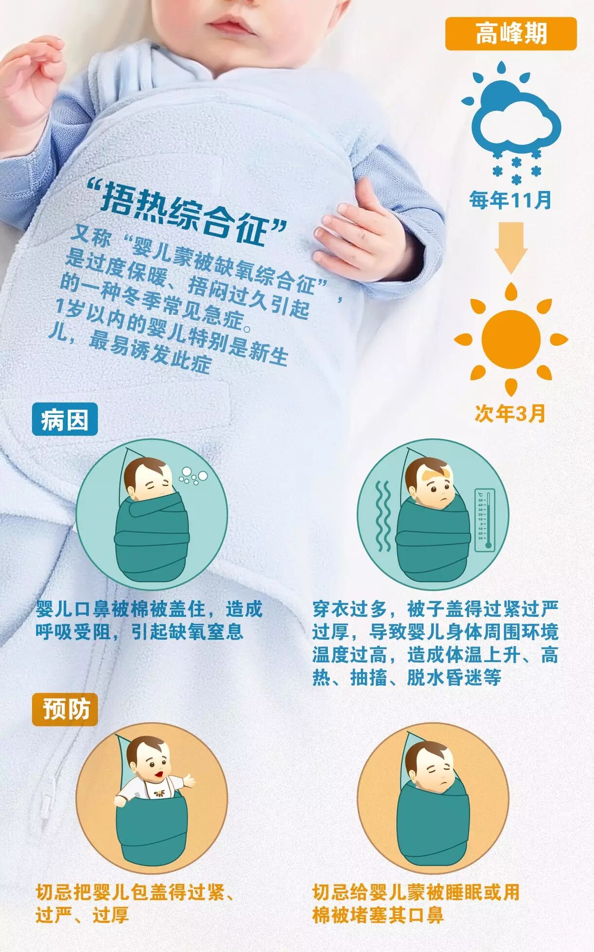 发生在念念身上的不幸,医学上称之为“捂热综合征”,是过度保暖、捂闷过久引起的一种冬季常见急症,每年11月至次年3月为高峰期。1岁以内的婴儿特别是新生儿,最易诱发此症。