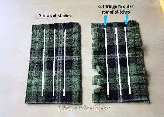 在刚刚的中线旁再缝两条平行线,和中线相隔大概2-2.5公分。然后把旁边的布剪成大约1公分宽的流苏型,注意不要剪到缝线。