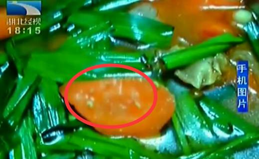 在谭女士出示的照片中,《经视直播》记者看到羊肉火锅里的一块萝卜上有5条白色的小虫。谭女士说,这些羊肉是在佛祖岭菜场一个她常去的摊贩处买的。为了保留证据,这些有虫子的羊肉汤她一直都没有倒。
