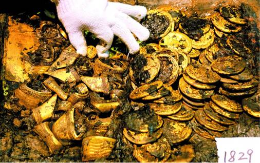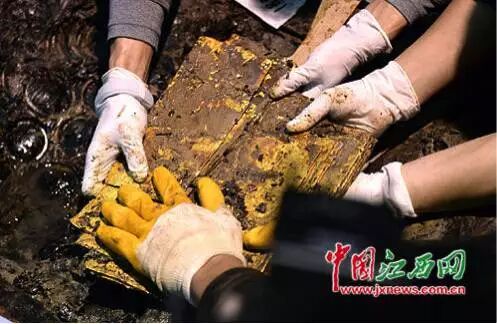 25日下午,南昌西汉海昏侯墓主棺柩的外棺和内棺之间的金器全部被提取出来,其中金饼96枚、马蹄金33枚、麟趾金15枚,另外还有金板20块。