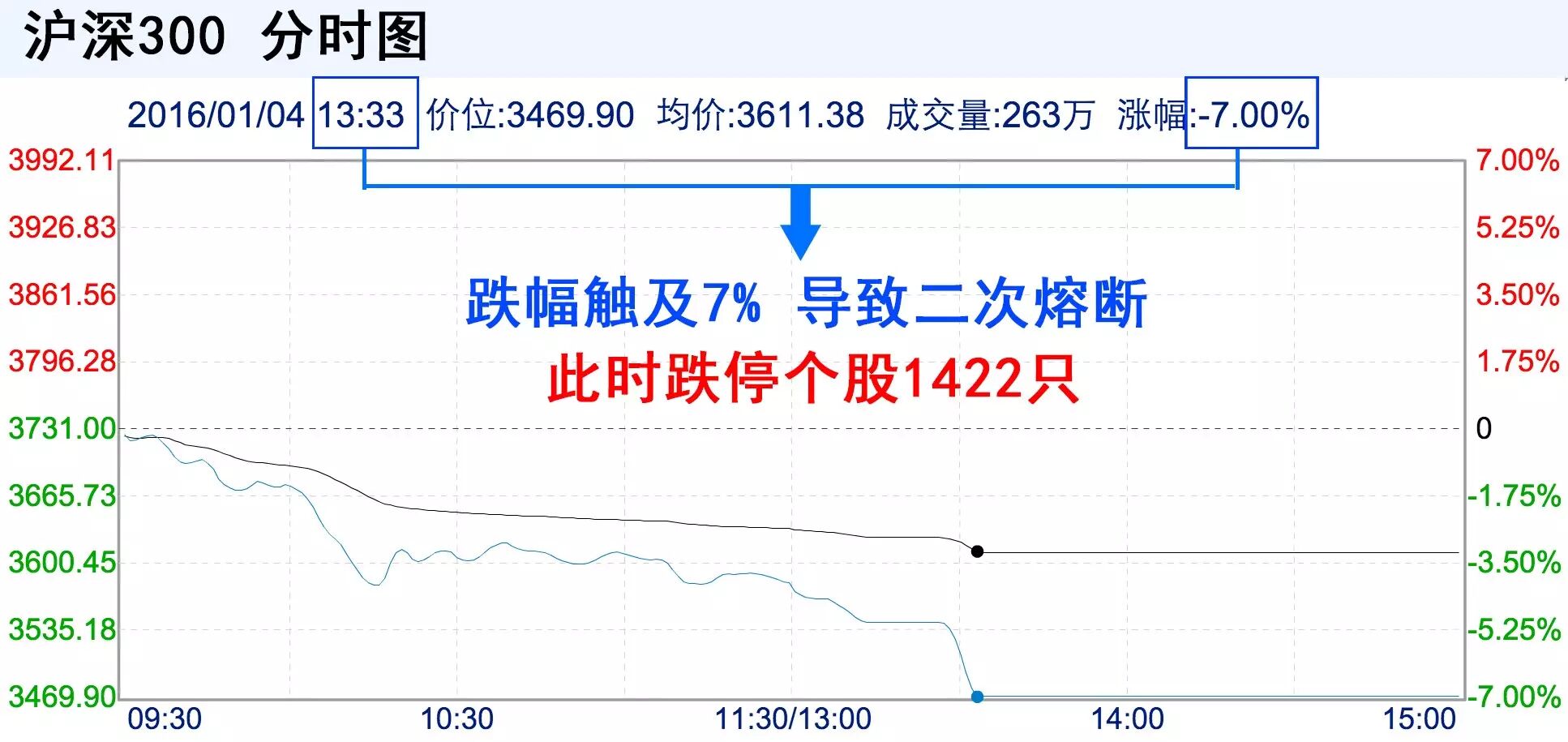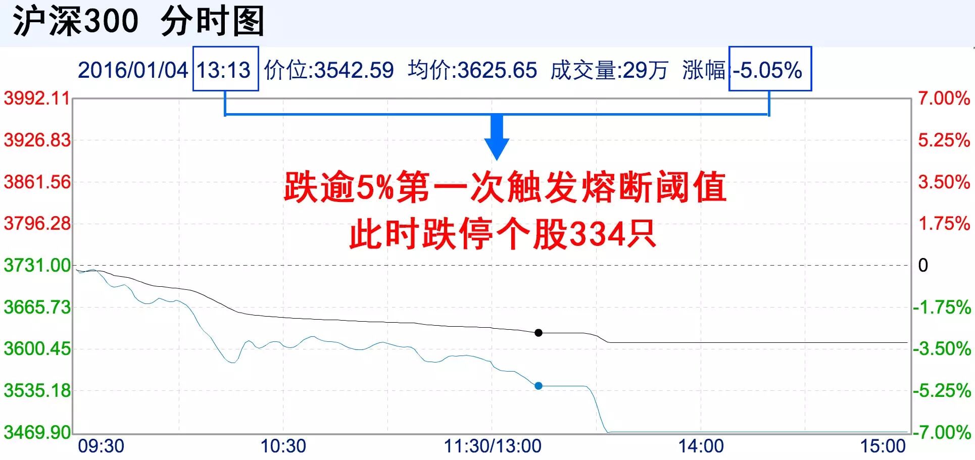 今天,新年首个交易日,也是熔断机制实施的首个交易日,沪深300指数在午后先后达到下跌5.05%和7%熔断阈值,股民提早1个半小时下班。不少网友苦涩调侃:见证了历史时刻。