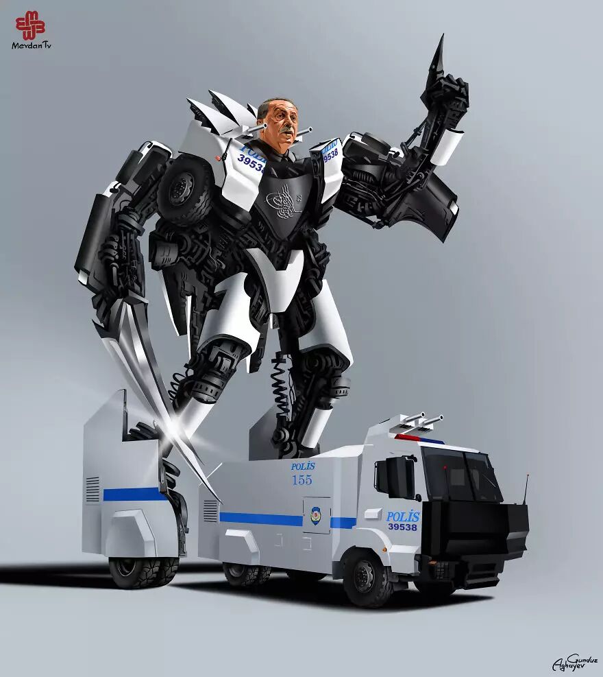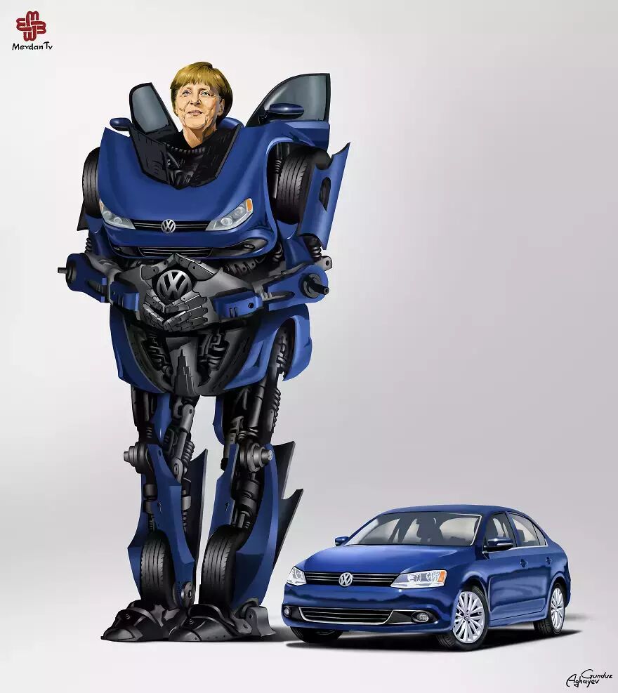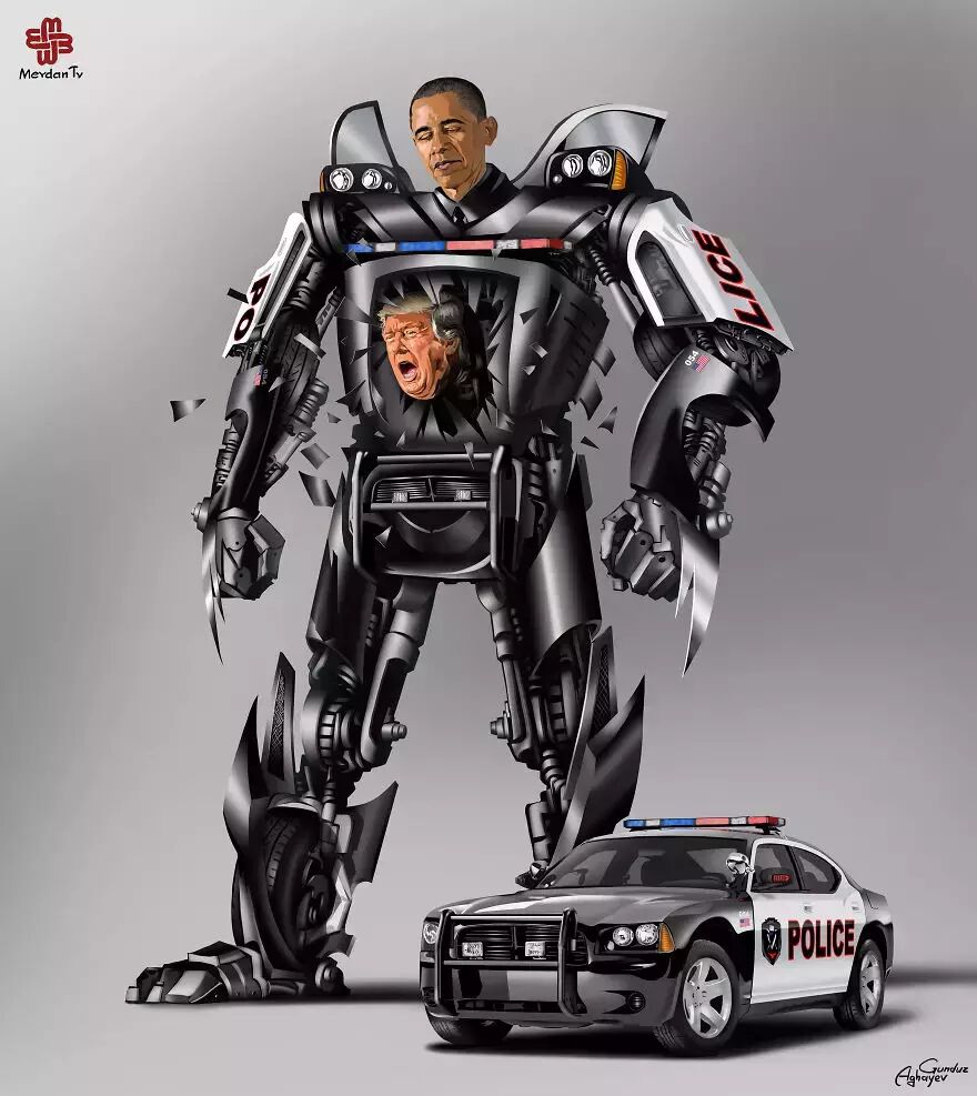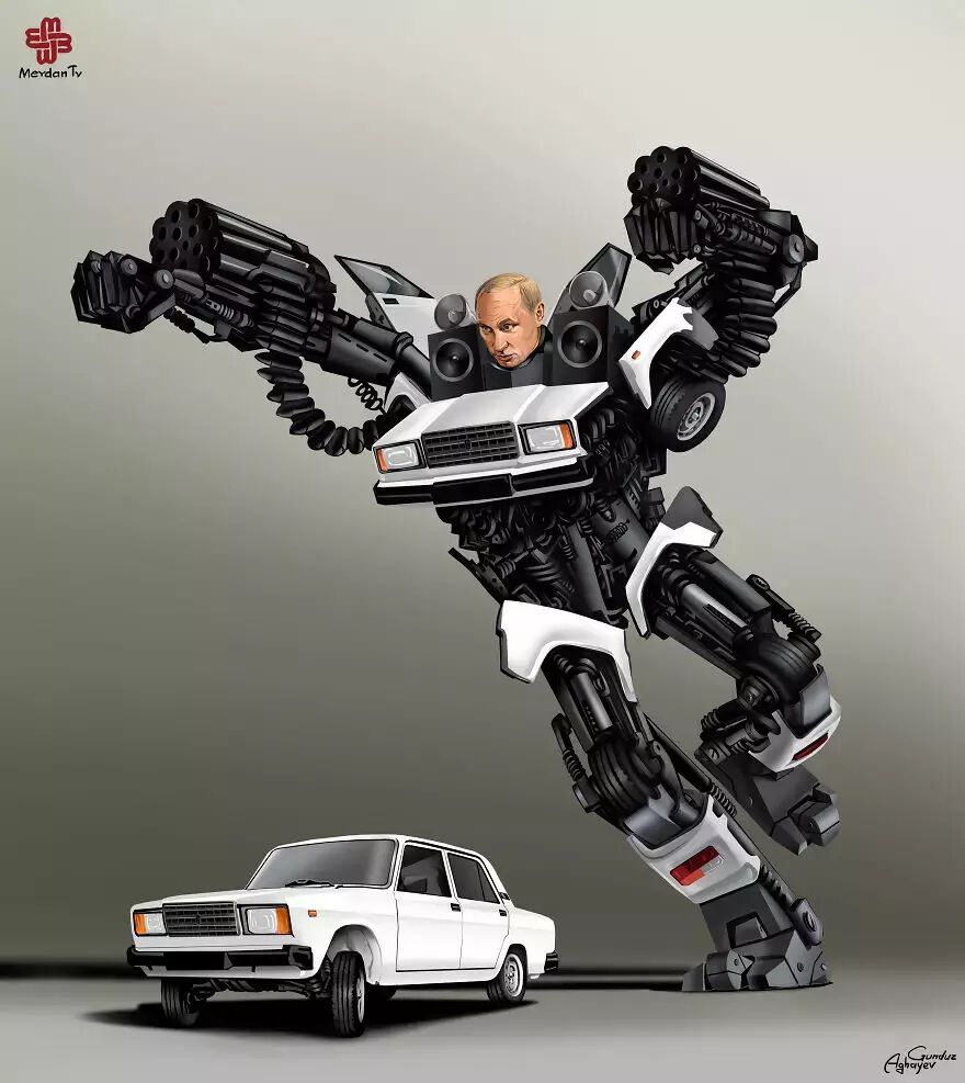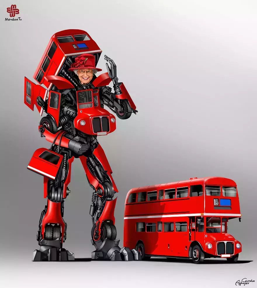 在这套2015年的作品中,Gunduz Agayev的笔锋再次瞄准了世界著名的领导人们,把这些政治家画成了变形金刚。英国女王、美国总统还有其他各路政坛大佬都没能逃出Gunduz Agayev的画笔。现在就让我们来看一下在这位鬼才插画家的笔下,政治家们到底是如何变身的。